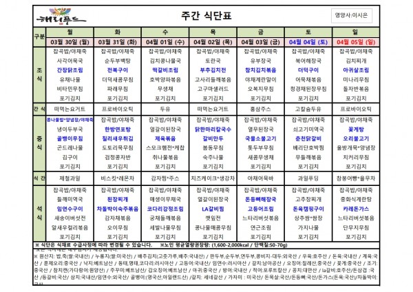 3월 다섯째주 식단표 페이지 정보 작성자 은천노인복지회 작성일26-03-26 17:49 조회7회 댓글0건 관련링크 다음글 목록 답변 본문 3월 다섯째주 어르신 식단표 안내해 드립니다. 정성과 영양을 담아 준비하겠습니다. 다음글 목록 답변