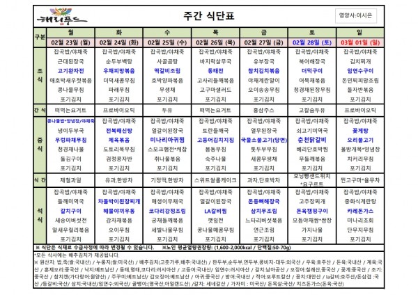 2월 넷째주 식단표 페이지 정보 작성자 은천노인복지회 작성일26-02-20 16:17 조회40회 댓글0건 관련링크 다음글 목록 답변 본문 2월 넷째주 어르신 식단표 안내해 드립니다. 정성과 영양을 담아 준비하겠습니다. 다음글 목록 답변