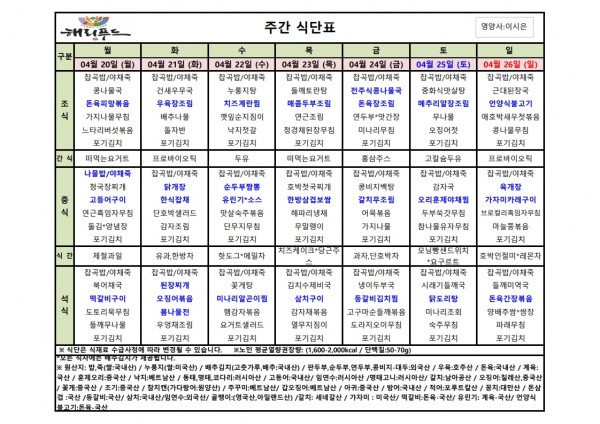 4월 셋째주 식단표 페이지 정보 작성자 은천노인복지회 작성일26-04-16 17:43 조회283회 댓글0건 관련링크 다음글 목록 답변 본문 4월 셋째주 어르신 식단표 안내해 드립니다. 정성과 영양을 담아 준비하겠습니다. 다음글 목록 답변