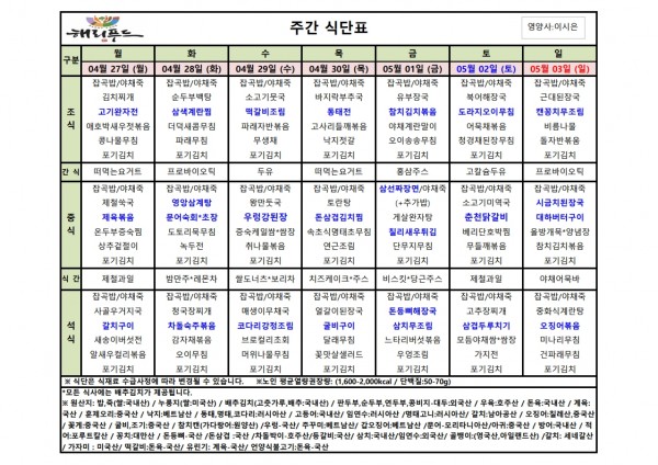 4월 넷째주 식단표 페이지 정보 작성자 은천노인복지회 작성일26-04-27 17:08 조회153회 댓글0건 관련링크 다음글 목록 답변 본문 4월 넷째주 어르신 식단표 안내해 드립니다. 정성과 영양을 담아 준비하겠습니다. 다음글 목록 답변