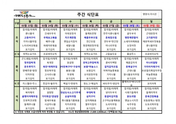 3월 넷째주 식단표 페이지 정보 작성자 은천노인복지회 작성일26-03-20 16:40 조회41회 댓글0건 관련링크 다음글 목록 답변 본문 3월 넷째주 어르신 식단표 안내해 드립니다. 정성과 영양을 담아 준비하겠습니다. 다음글 목록 답변