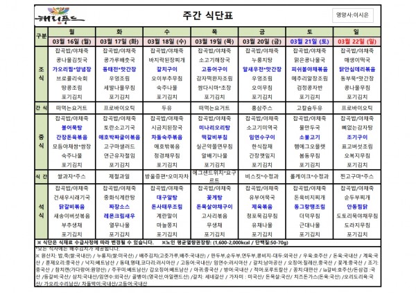 3월 셋째주 식단표 페이지 정보 작성자 은천노인복지회 작성일26-03-13 15:20 조회790회 댓글0건 관련링크 다음글 목록 답변 본문 3월 셋째주 어르신 식단표 안내해 드립니다. 정성과 영양을 담아 준비하겠습니다. 다음글 목록 답변